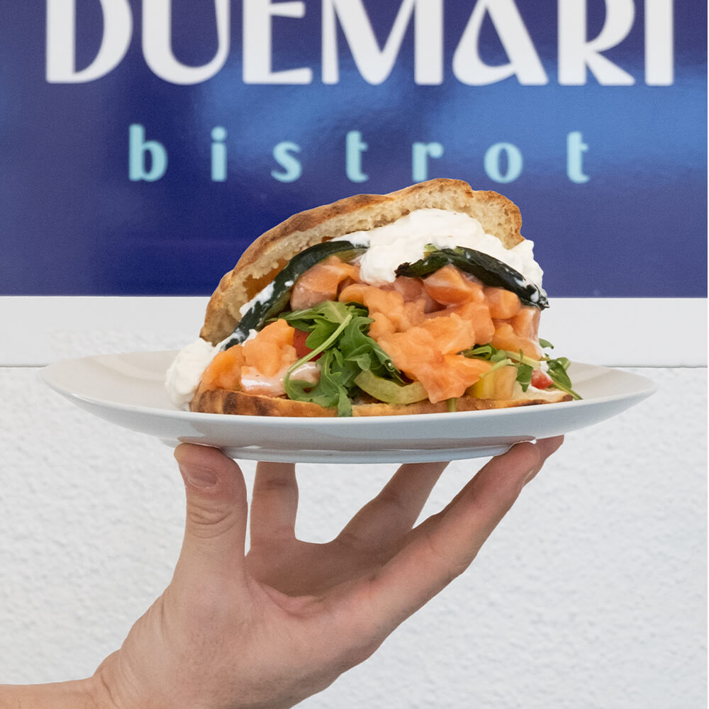 Puccia salentina, Tartare di Salmone, Stracciatella, Pomodoro, Rucola e Zucchine grigliate